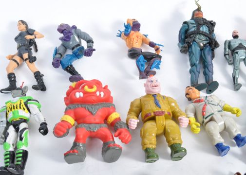 A large collection of approx 40x assorted retro vintage action figures & playsets vehicles to include TMHT / TMNT Teenage Mutant Ninja / Hero Turtles, Jurassic Park, Power Rangers, Biker Mice From Mars, MOTU He Man, Visionaries, WWF, Terminator and many many more. Great collection.