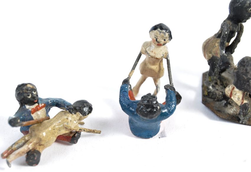 A collection of x3 rare early 20th century possibly Victorian cold painted lead Golliwog figures - all of lead and wire construction, depicting pairs of figures. Painted in traditional form. Along with a similar lead group of three figures. Unknown make. Rare. Tallest approx; 4.5cm.