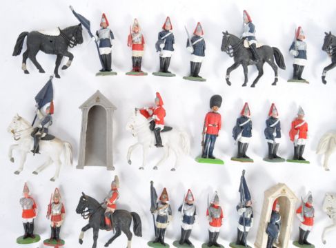 A collection of original vintage Britains made plastic soldiers / figures - largely Queen's Life Guards, but some others also present. Various poses, includes some mounted on horseback. Most marked with Britains makers marks to base.