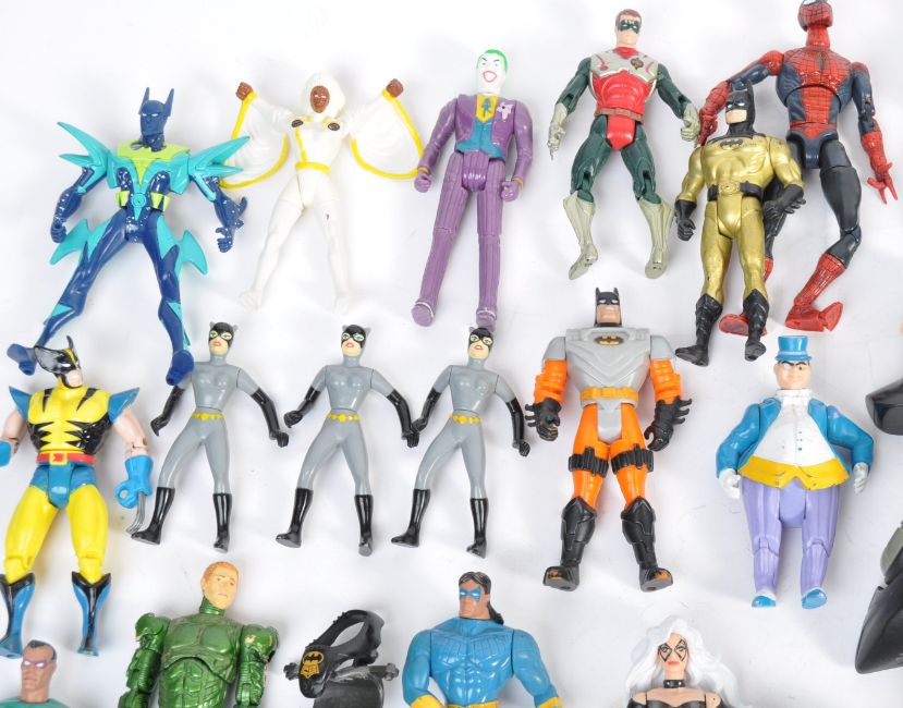 A large collection of approx 40x assorted retro vintage action figures & playsets vehicles to include Batman, Batmobile, X-Men, Spiderman, Punisher, Logan, Penguin, Venom, Robin. and many many more. Great collection.