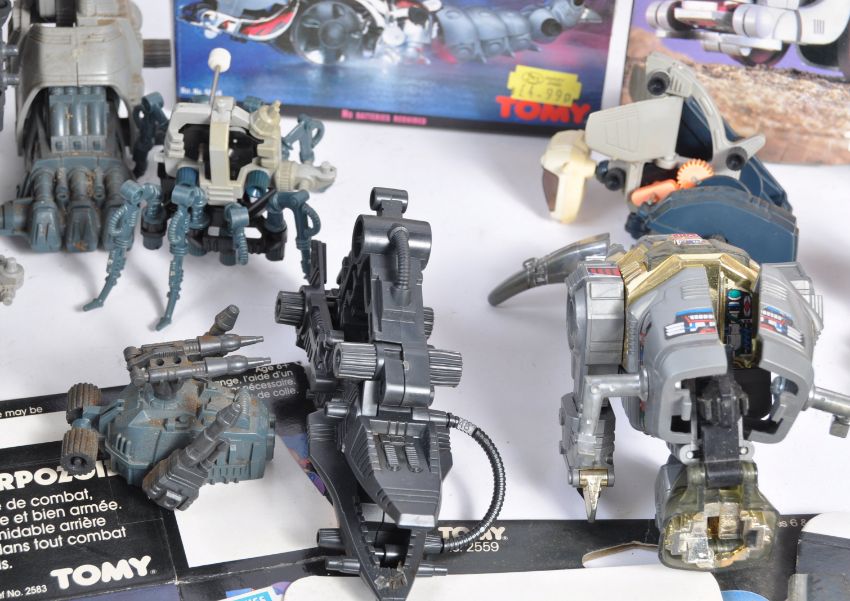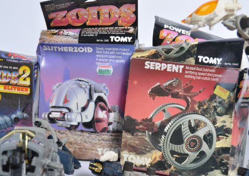 A large collection of assorted vintage Tomy made ' Zoids ' robotic action figures / playsets. Includes several unboxed sets, some boxed, and several empty boxes / packets. Includes; Tank, Slitherzoid, Serpent, Mighty Zoidzilla and others. Great collection. Completeness not checked.