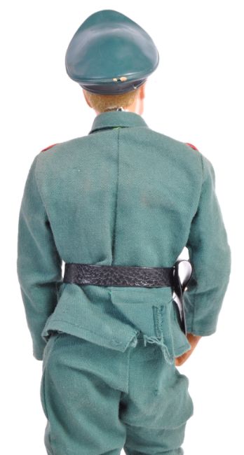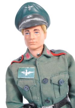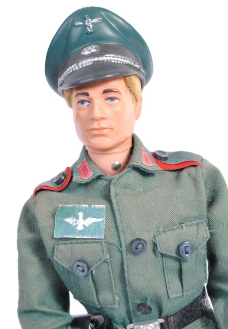 An original vintage 1970's (1974) Palitoy made Action Man ' German Staff Officer ' action figure. With uniform - comprising: Boots, trousers, jacket, waist belt, holster and cap. Figure an early blonde flocked hair variation. Includes original wooden red, white and black striped sentry box. Rare