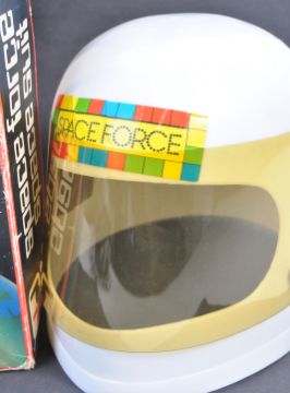 A rare original vintage Dekker Toys / Dekkertoys ' Let's Pretend ' playsuit set ' Space Force Space Suit '. Comprising of a plastic helmet, trousers, jacket, bib, gloves and boot covers. Complete. All housed within the original box. A rare sci-fi related dress-up playset.