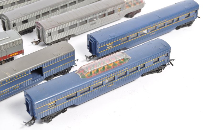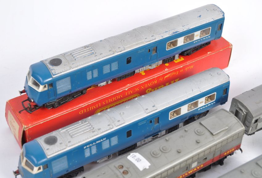 A collection of original Triang made 00 gauge model railway train set locomotive sets comprising a Blue Pullman Engine & Dummy set, grey Triang loco (dummy) and three carriages along with a 4008 diesel loco and 3x blue coaches. All locos appear to work. Good collection.