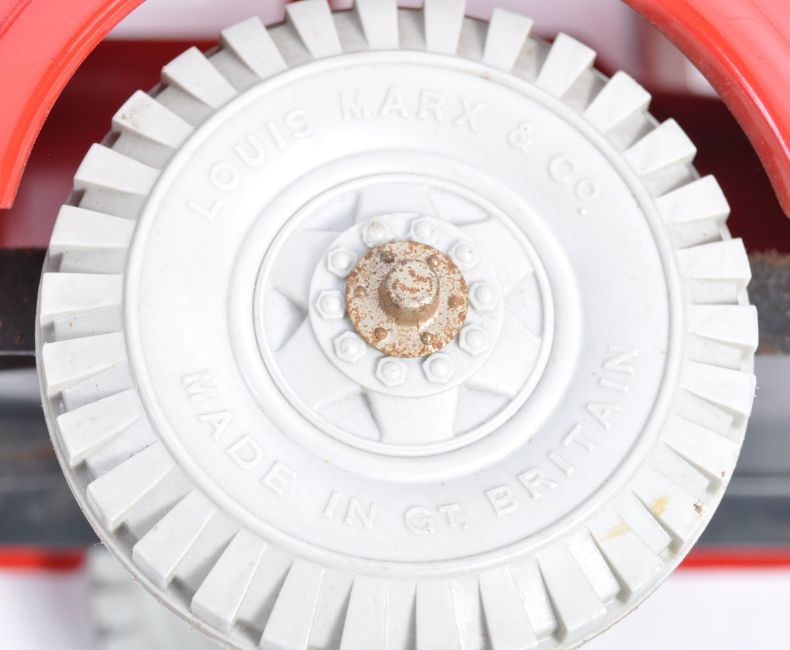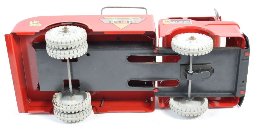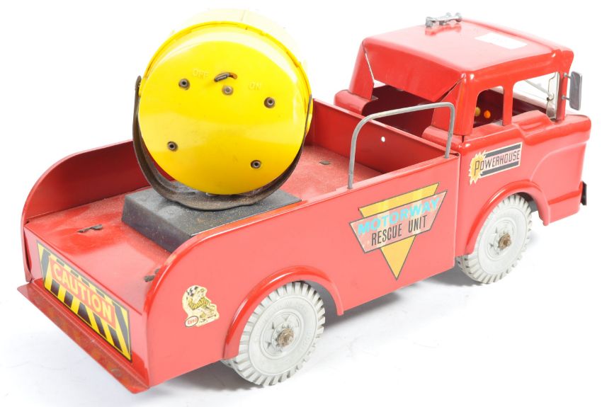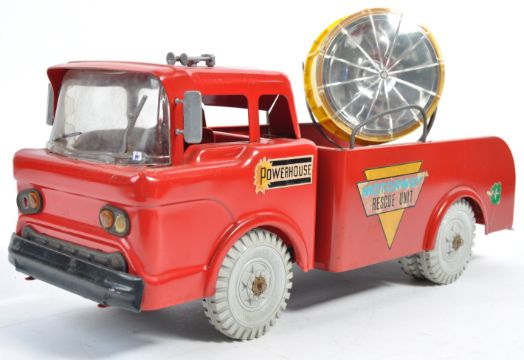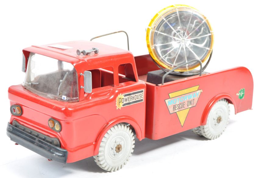 A rare original 1950's Louis Marx & Co tinplate battery operated searchlight truck toy Powerhouse Motorway Rescue Unit. Red metal body with yellow plastic revolving searchlight and original grey plastic wheels. Wonderful vintage toy. Measures: 45cm long.