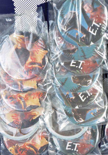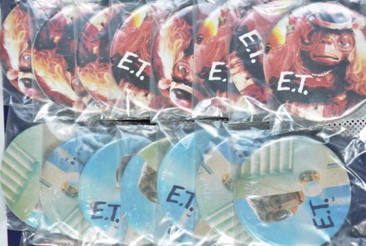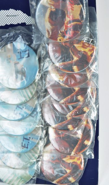 A rare vintage Present Needs made ET The Extra Terrestrial in-store point of sale advertising shop display board of unused pin badges. The badges of x5 different designs, each with a different scene from the film. Each badge unused and still stapled to the original display board. Rare.