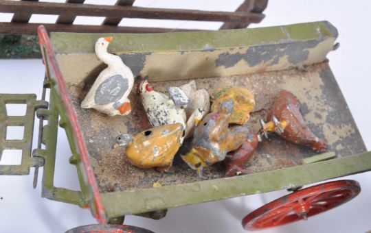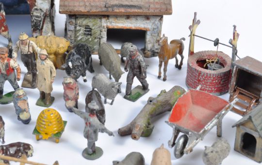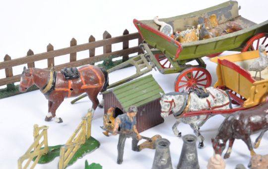 A good collection of vintage / early mostly Britains made lead farm animals and figures. Along with some early wooden stables and outbuildings. Includes; Milk Maid, Hay Bales, Horse and Cart, Pigs, Horses, Sheep, fence section and other items. Interesting collection.