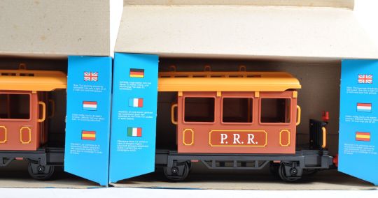 A collection of x3 original vintage Playmobil G Scale model railway trainset carriages set No 4120 ' Western Passenger Car '. Appear unused, in mint condition within original boxes. Great examples.