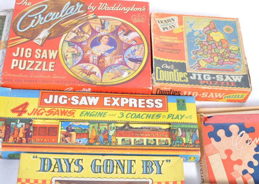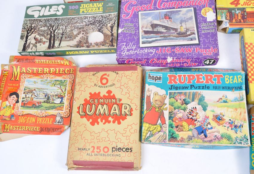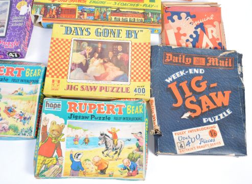 A collection of assorted antique / vintage children's jigsaw puzzles, to include ' Jig-Saw Express ,' Days Gone, Rupert The Bear, The Good Companion (Shipping Interest), and others. All within their original boxes. Completeness unchecked.