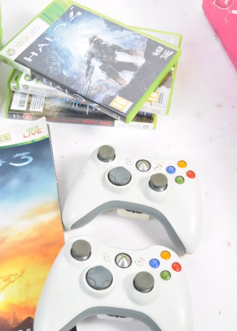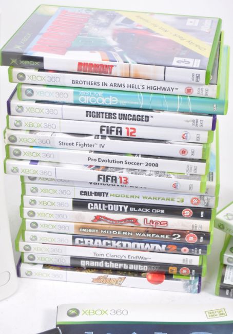 An original Microsoft made XBox / X Box 360 games console, with power cable, TV cable and x2 controllers, along with a quantity of games to include; Call Of Duty (various versions), HALO, Fifa 12, Final Fantasy XIII, Burnout and others. Console untested, but all games present within their boxes.