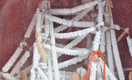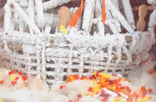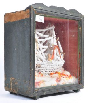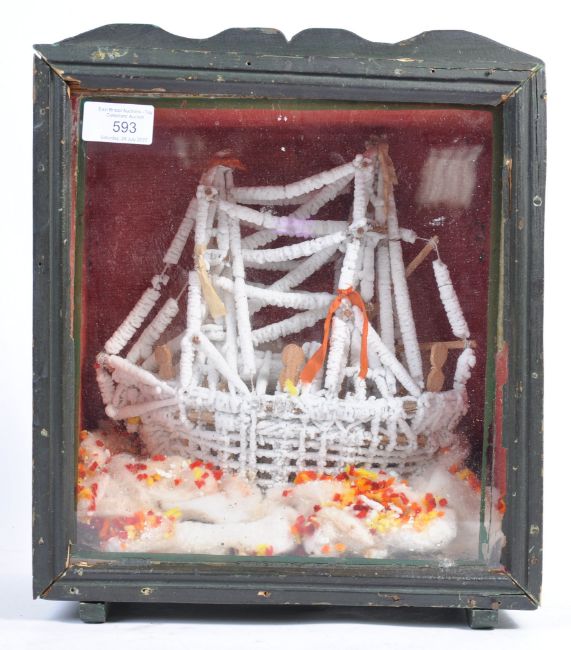 An unusual antique 19th century Victorian diorama of a sailing ship, sugar and wood construction. The ship with two masts rigging and other fine details. Mounted on a cotton wool sea. Housed within its original period glass display cabinet. Measures 33x28x16cm.