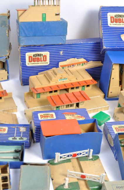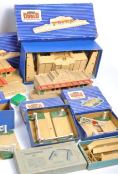 A collection of original vintage Hornby Dublo 00 gauge model railway train set trackside accessories comprising multiple D1 items including: boxed Level Crossing, Footbridge, Signals, Buffer Stop, Signal Cabin and multiple boxed and unboxed Through Station's. Along with a boxed Dinky Toys Station Staff 051 (incomplete). Most items boxed. Great collection.