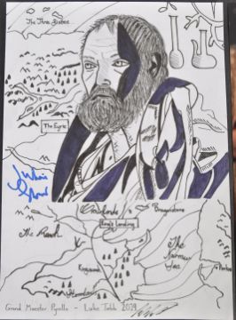 Private Collection of Julian Glover - Fan Artwork - a charming piece of original fan artwork as gifted to Mr Glover in 2019. The ink artwork depicts Glover in his roll in Game Of Thrones. Featuring maps and locations underneath and to the side of his image. Signed by the artist, and also by Mr Glover. Also includes an autographed 8x12" colour photograph of Glover from Game Of Thrones.