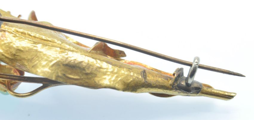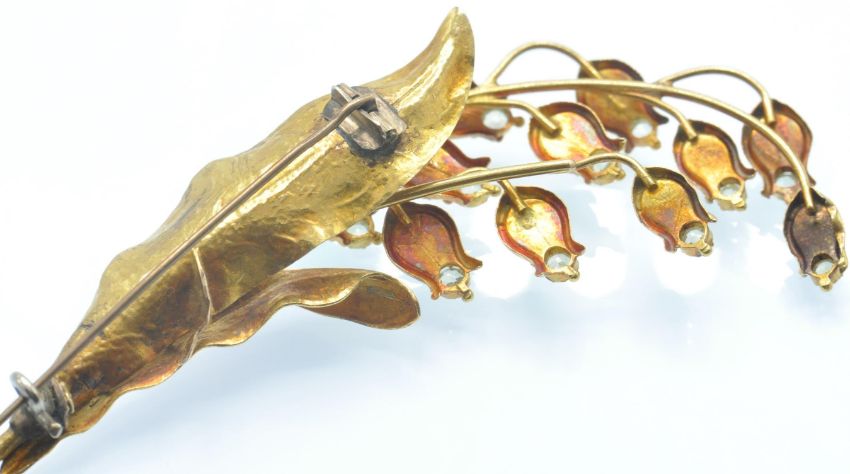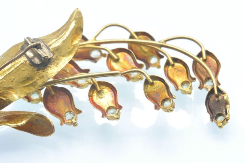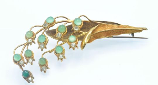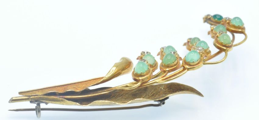 A large antique gold and gemstone spray brooch. The brooch in the form of a spray of Lily of the Valley, symbolising return to happiness, being set with gemstones (likely chrysoprase and quartz) with stylised leaves. C clasp and pin fastener verso. Unmarked tests indicate high carat gold. Measures 3 1/4 inches. Total weight 13.2g.