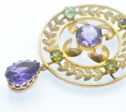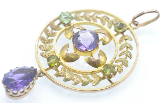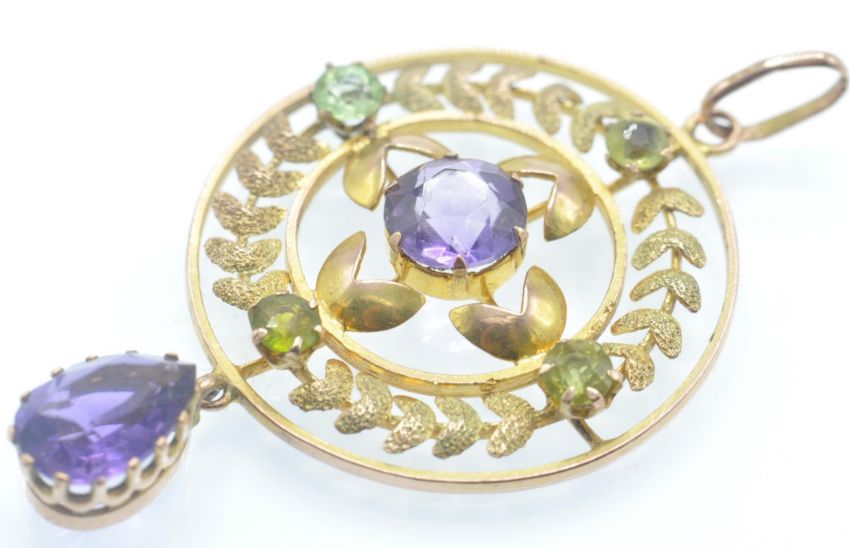 An early 20th century amethyst necklace pendant. The pendant strung with an amethyst drop, surmounted by an openwork wreath decorated roundel, with central round mixed cut amethyst and accent green stones. Measures 11/2 inches. Weight 3g.