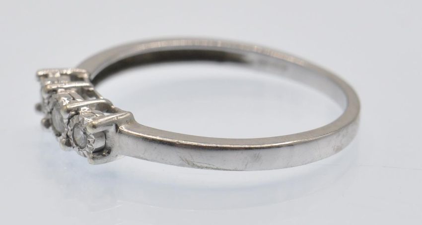 A hallmarked 9ct white gold three stone diamond ring. The ring set with three round brilliant cut diamonds in illusion settings. Size P.5. Weight 1.9g