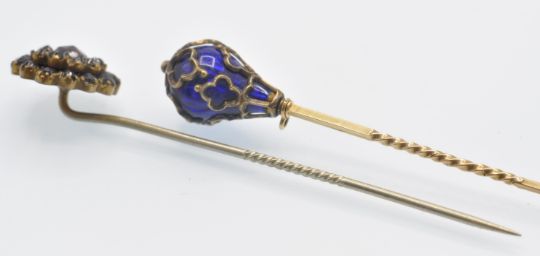 Two antique stick pins. An antique gold enamel and filigree work stick pin having a bulbous form head with enamel and filigree work Alhambra style decoration, completed with safety bale, measures 6.8cms. Together with a garnet set stick pin, measures 5.3mm. Total weight 5g.