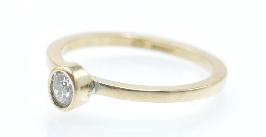 A hallmarked contemporary 18ct gold solitaire diamond ring. The ring having an oval cut diamond in a bezel setting to plain band. Hallmarked London . Estimated diamond weight 0.10ct. Weight 2.8g. Size O / 7/ 55.