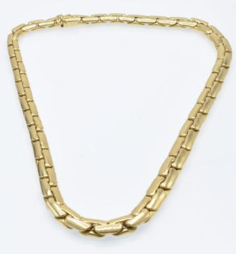 An 18ct Gold fancy Link Chain Necklace. The necklace formed of undulating graduated links with sleak hidden clip clasp. Marked 750 Handarbeit (hand made) with makers mark.  Weight 63.6g. measures 17inches. Widest point approx 9mm, reducing to to 5mm by clasp.