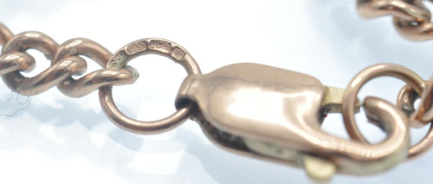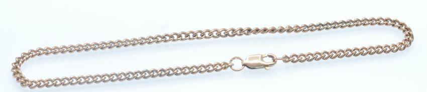 A hallmarked 9ct rose gold bracelet. The bracelet formed from curb links united by lobster claw clasp. Hallmarked Sheffield. Weight 5.4g. Measures 9.5inches.