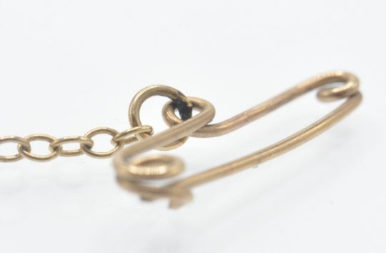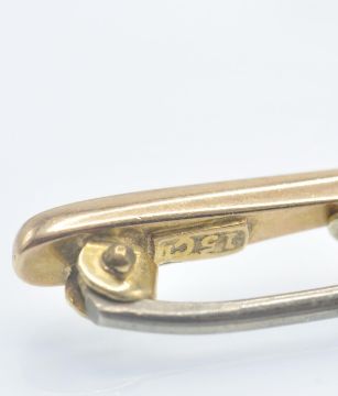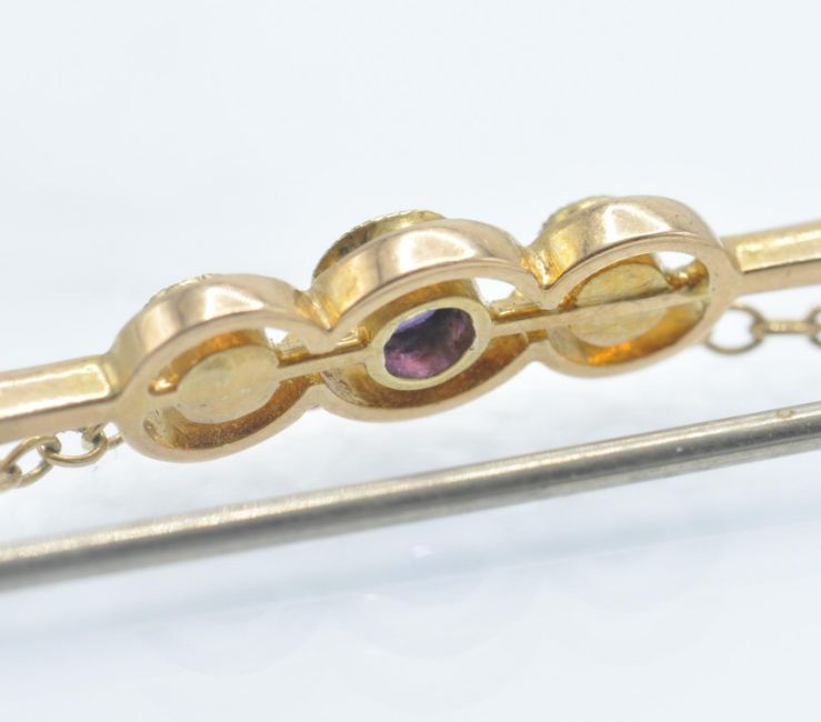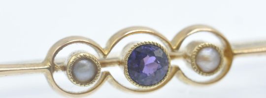 An antique 15ct gold amethyst and pearl bar brooch pin. The brooch se with a round mixed cu amethyst flanked by two half pearls to tapering bulbous bar with C clasp fastener and safety chain. Marked 15ct . Weight 3.5g. Measures approx 2 inches.
