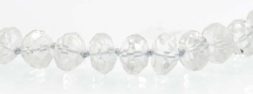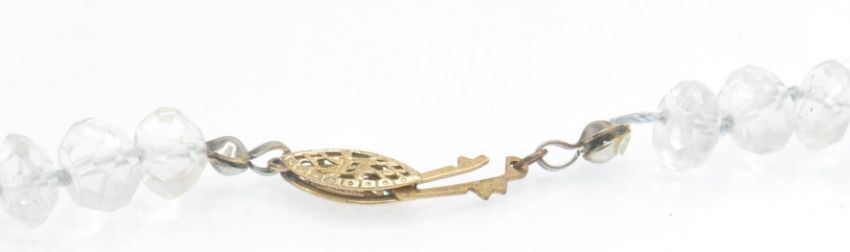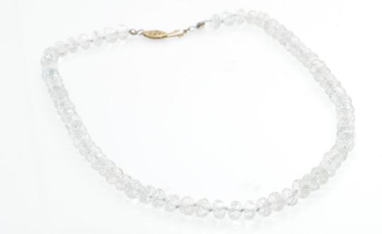 An aquamarine bead necklace. The necklace strung with faceted aquamarine beads on a braided and knotted silk with yellow metal clasp. Measures approx 16.5 inches.
