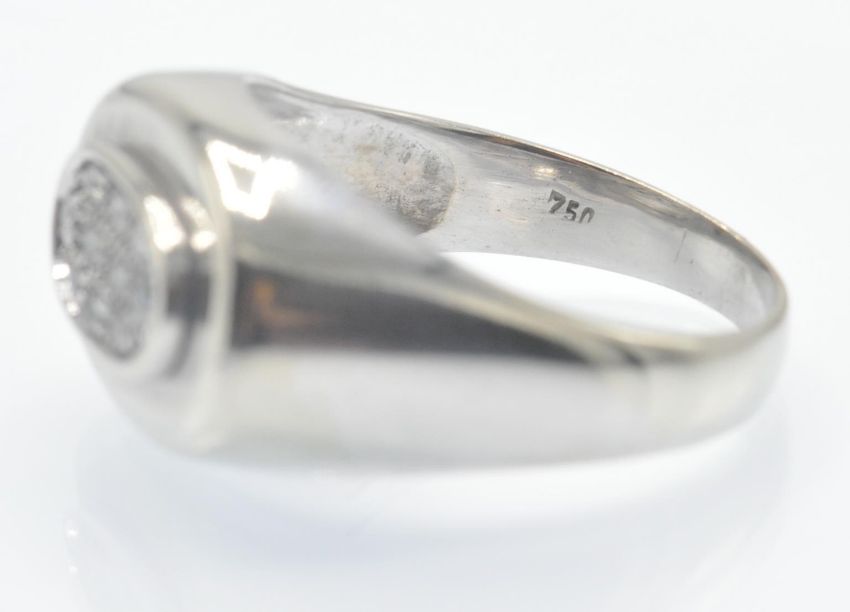 An 18ct white gold retro diamond cluster ring. The ring having a wide lozenge top set with 10 single cut diamonds to a dark illusion setting. Marked 750 tests indicate 18ct gold. Estimated diamond weight 0.20ct. Weight 7g. Size Q/8/58.