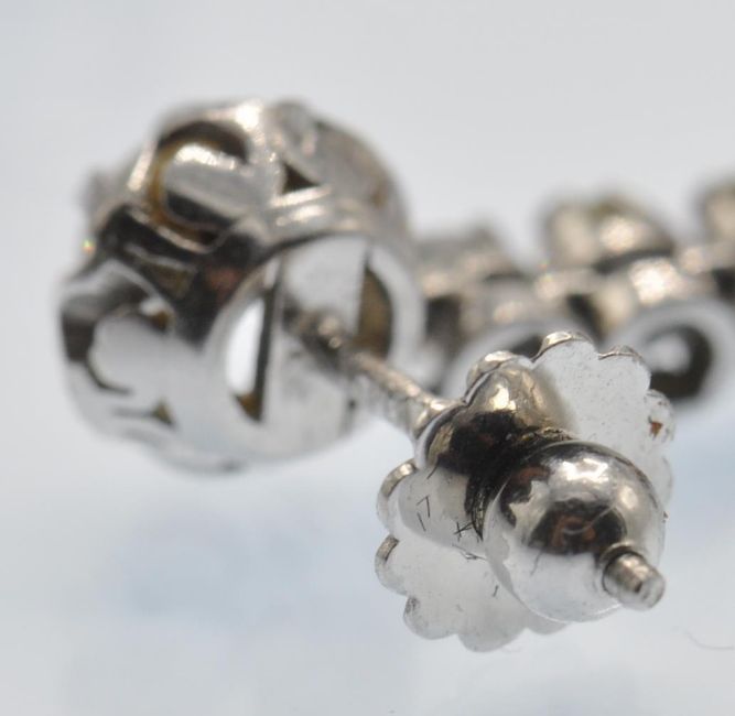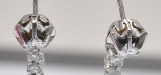 A pair of antique 18ct white gold and platinum diamond 5 stone drop earrings. The earrings set with graduating diamonds, in scalloped prong settings, to screw post fasteners. Marked - French Mascaron mark to post. Estimated total diamond weight 0.60ct 0.5ct 0.5ct 0.5ct 0.20ct each, total 1.90ct. Weight 3.2g Measures 3.5cm drop.
