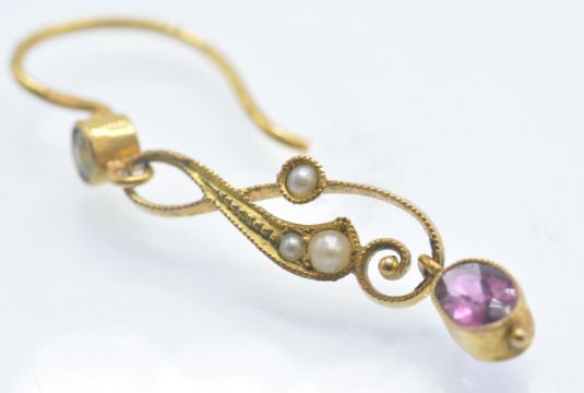 A pair of  Antique 9ct gold garnet, peridot and pearl pendant earrings. The earrings in the Art Nouveau style having garnet drops surmounted by a scroll set with pearls, completed by peridot stud and hook fasteners. Marked 9ct tests indicate 9ct gold. Measures approx 1 inch drop. Weight 1.6g.