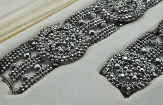A Georgian 19th century cased cut steel necklace and bracelet suite. The suite contained in a heavy leather fitted case curated by N Bloom & Son London. The set possibly designed to be worn as a chocker necklace with two parts joined or as a singular bracelet. The steels individually cut and riveted to give the candlelight sparkle completed with tongue and grove clasps. Slight differences in sizes of roundels, attention needed for fitting of tongue and grove clasp to join pieces. Possibly a later adjustment or a part of further pieces. Measures approx : Largest piece 8 1/4 inches, smallest 4 1/2 inches.