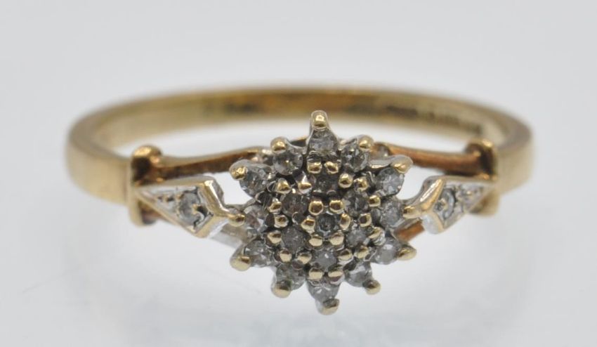 A hallmarked 9ct gold and diamond cluster ring. The ring set with a concentric layers of diamonds having diamond set shoulders. Size N. Estimated diamond weight 0.15ct. Weight 1.9g.