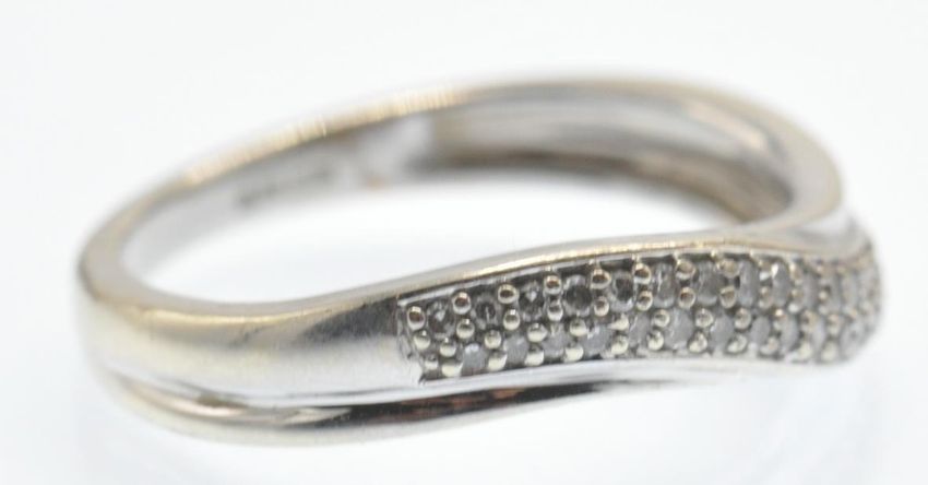 A hallmarked 9ct gold and diamond band ring. The ring having pavé set diamonds in a swirl motif to plain band. Estimated diamond weight 0.15ct. Weight 2.4g. Size L.