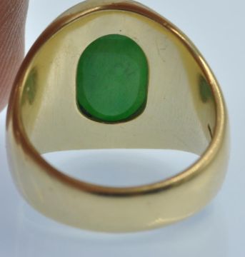 A hallmarked 18ct gold and jade signet ring. The ring having a bezel green jade cabochon. Hallmarked London. Cabochon measures 14.6mm x 11mmx 5.6mm. Weight 21.3g. Size Q.5 / 8.25/ 58.