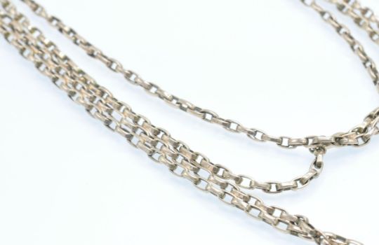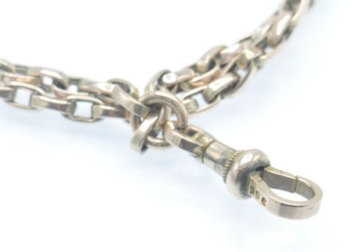 An antique 9ct gold guard chain. The chain formed of elongated cable links with dog clasp. Measures 62 inches. Clasp marked 9ct, tests indicate 9ct gold. Weight 31.8g. Measures approx 64inches.