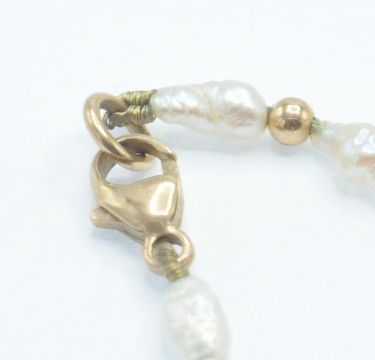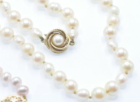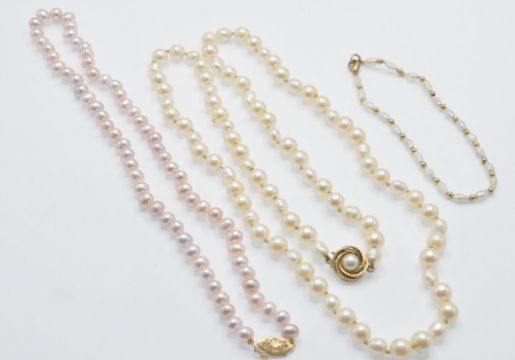 Two cultured pearl necklaces and a bracelet. A pink perl necklace having knotted off round cultured pearls with yellow metal clasp marked 375, a round and off round string of pearls  having a hallmarked 9ct gold clasp in the form of a pearl set knot. A 9ct gold and keshi pearl bracelet. Measures:- Necklace Pink 16 inches, Cream 26 inches, Bracelet 7 1/2 inches.