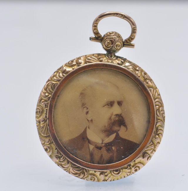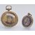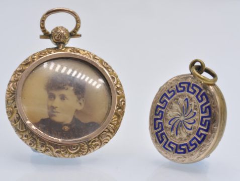 Two antique gold lockets. The lockets to include one 9ct gold in the form of a watch fob having frame of a foliate decorated boarder. The second having enamel decorated gold front and back with etched foliate decoration. Weight 14.4g. Size largest 1 3/4 inches.