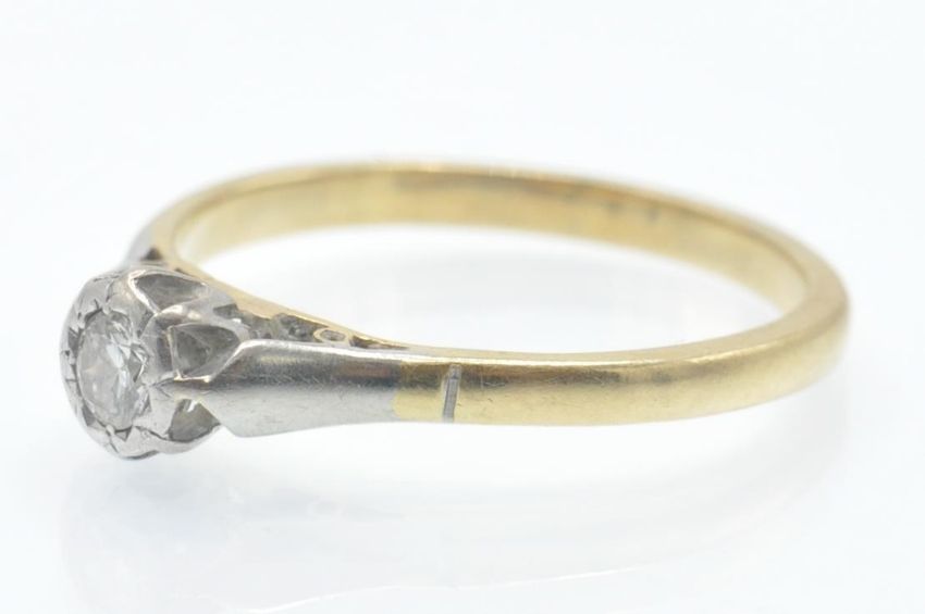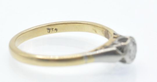 An antique 18ct gold and platinum solitaire diamond ring. The ring set with a round brilliant cut diamond in a raised  an open bezel setting. Estimated diamond weight 0.10ct. Weight 2.7g. Marked 750 tests indicate 18ct gold. Size O.5/7.5/56.