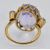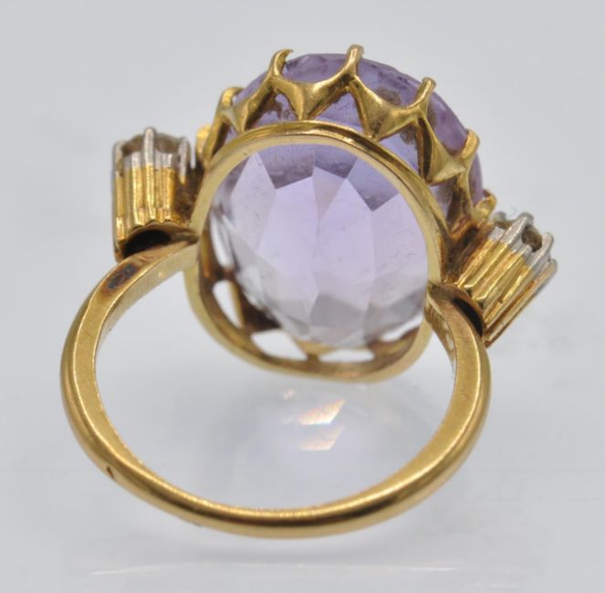 A French 18ct gold amethyst and diamond ring. The ring set with a large oval mixed cut amethyst, in a pierced prong setting, flanked by two old cut diamonds set in reeded mounts. Amethyst 17mm x 12.8mm x 8.8mm. Weight 5.9g. Size K/ 5.25/ 50.
