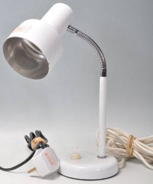 A set of three vintage 20th Century anglepoise gooseneck desk lamps each raise don round bases with chrome posable necks and cylindrical shades, to include white, blue and yellow examples.