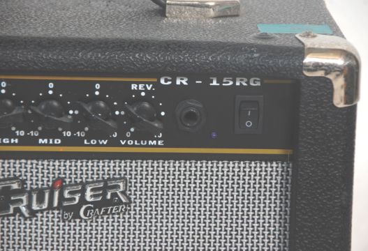 A children's Encore electric guitar having a black body with marked fret board and chrome tuning pegs. Together with a Cruiser CR 15RG amplifier and boxed Fender Amp Stand and a A C. Giants children's Fender Stratocaster style six string electric guitar having a red finished body and marked fretboard.