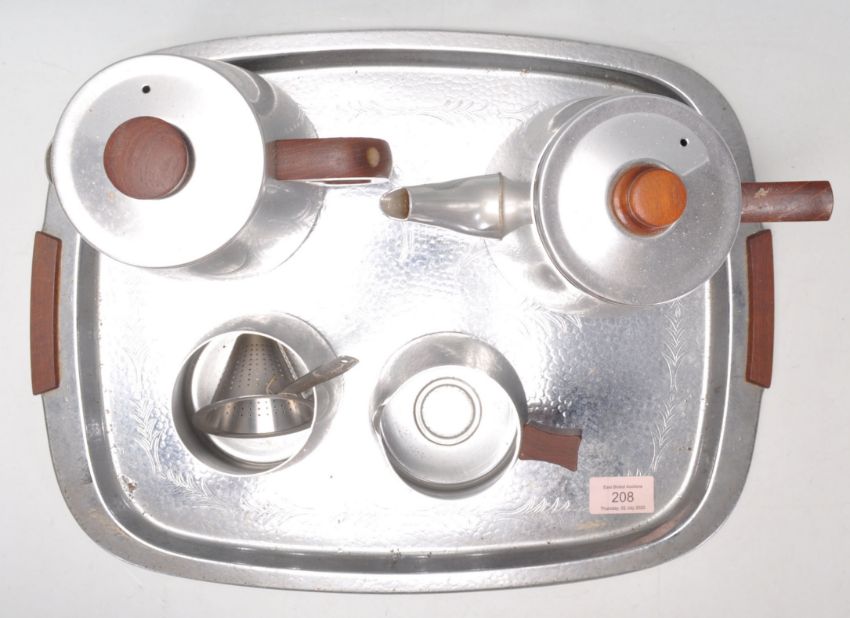 A retro mid century Sona stainless steel Coffee & Tea service complete with tray having teapot, coffee pot, sugar bowl and creamer etc. Stamped to the underside.