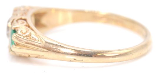 An impressive 9ct yellow gold emerald and diamond three stone ring. Weighs 3.1g Size 8.Q. .33 points