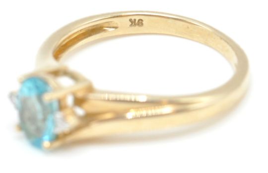 2 9ct gold hallmarked rings. To include a topaz and diamond ring in shaped prong setting hallmarked for London, weight 2.79g / SIze O together with a Birmingham hallmarked ring  with amethyst oval cut stone set to reeded tapering shoulders,  Weight 2.52 / Size N.