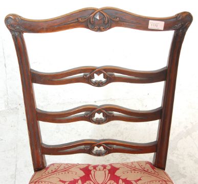 A pair of 18th century mahogany Chippendale revival mahogany dining chairs. Raised on  square tapering legs united by stretchers. Overstuffed seats with railed back rests having pierced bars with cross over design culminating in a well carved detailed and shaped top rail. Measures 95x50x46cm.