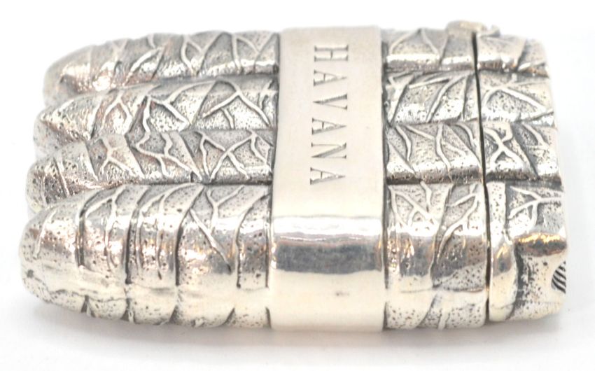A silver vesta case in the form of four cuban cigars and the word Havana stamped on both sides. Match striker to the base with a hinged lid. Weight 36.3grams. Measures 4cm long.