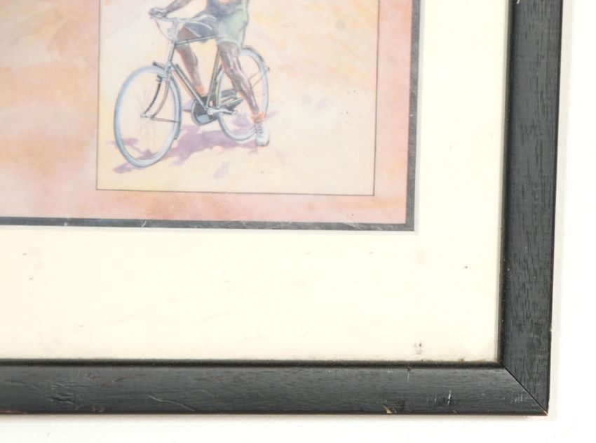 A vintage Raleigh advertising poster 'The All Steel Bicycle' depicting a man riding a bicycle whilst being chased by a lion. Framed and glazed.