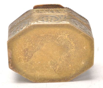 An Antique Italian micro mosaic brass pill box with mosaic floral decoration to the cover and engraved decoration to the body. Measures 2cm tall by 3.5cm wide.