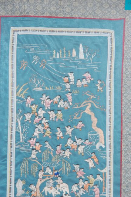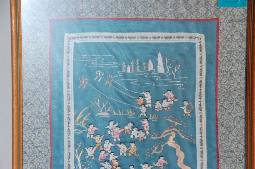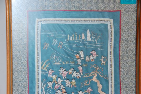 A mid 20th Century Chinese rectangular silk panel having embroidered one-hundred children playing in various coloured silks on a metallic green ground. Framed and glazed. Measures 70cm x 35cm.