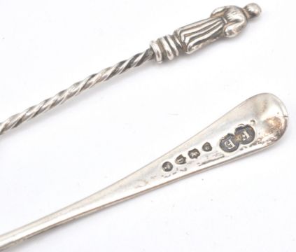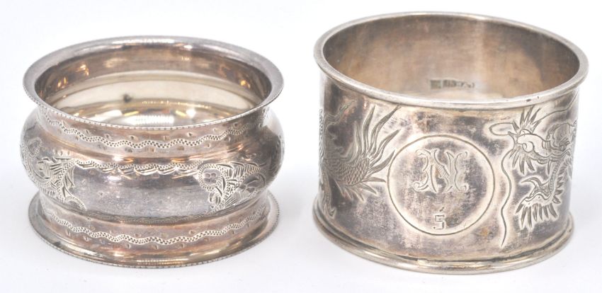 A group of silver hallmarked wares to include a late Victorian mustard pot raised on ball feet, hallmarked for Chester date letter O 1897 James Deakin & Sons (John & William F Deakin). Two silver napkin rings one engraved with a dragon bearing Chinese marks and three silver condiment spoons. Total weight 129g.
