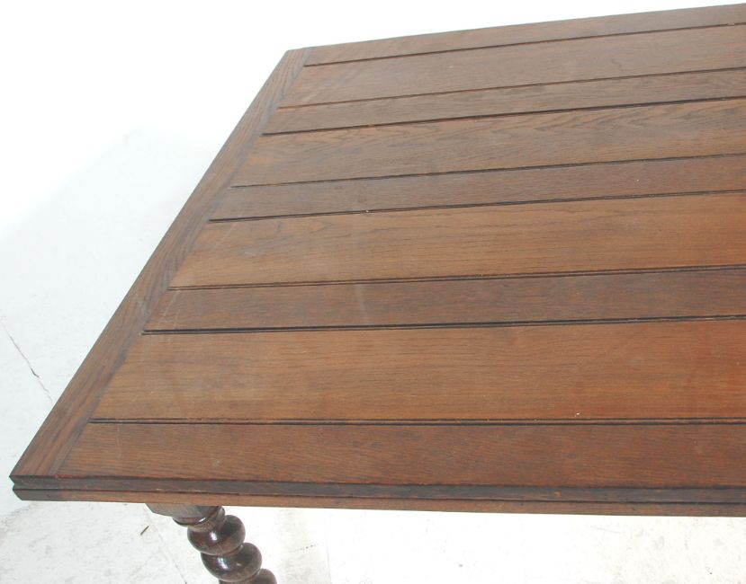 An early 20th Century oak drawer leaf dining table raised on barley twist supports with block ends. Measures 76x153x99cm.